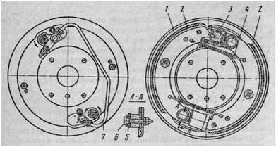 Тормозной механизм заднего колеса смонтирован на опорном диске 1, который жестко крепится к фланцу кожуха полуоси и состоит из двух тормозных колодок 2, опирающихся нижними концами через эксцентрики 7 на пальцы 8. Верхние концы колодок соединены стяжной пружиной 3. Разжимное усилие на колодки передается от одного колесного цилиндра 4, размещенного в верхней части опорного диска…