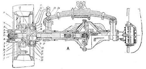 а — вид спереди; б — вид в плане; 1 — болт; 2 — опора; 3 — конический роликовый подшипник ступицы колеса; 4 — цапфа колеса; 5 — фланец ступицы; 6 — контргайка; 7 — ступица колеса; 8 — стопорная шайба; 9 — регулировочная гайка; 10 — стопорный штифт; 11 — диск колеса; 12 — ведущий шарик шарнира равных угловых скоростей; 13 —масленка; 14 — центральный шарик шарнира равных угловых скоростей; 15 — рулевой рычаг; 16 — конический роликовый подшипник шкворня поворотного кулака; 17 — сальник; 18 — шаровая опора поворотного кулака; 19 — упорная шайба; 20 — головка кулака шарнира равных угловых скоростей; 21 — шкворень поворотного кулака; 22 — гайка; 23 — обод колеса; 24 — наружный ведомый кулак шарнира равных угловых скоростей; 25 — внутренний ведомый кулак шарнира равных угловых скоростей; 26 — продольная рулевая тяга; 27 — поворотный рычаг; 28 — задняя рессора; 29 — поперечная рулевая тяга; 30 — корпус поворотного кулака; 31 — палец наконечника поперечной рулевой тяги; 32 — наконечник поперечной рулевой тяги.